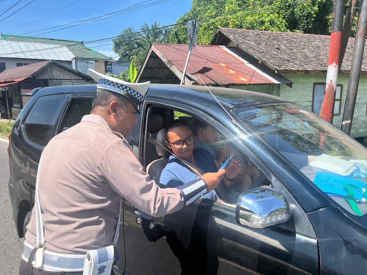 Personil Satlantas Polres Katingan sebagai anggota preemtif bergerak turun ke Jalan untuk meninformasikan kepada pengendara melalui pembagian brosur, untuk menciptakan keamanan dan keselamatan berlalu lintas.